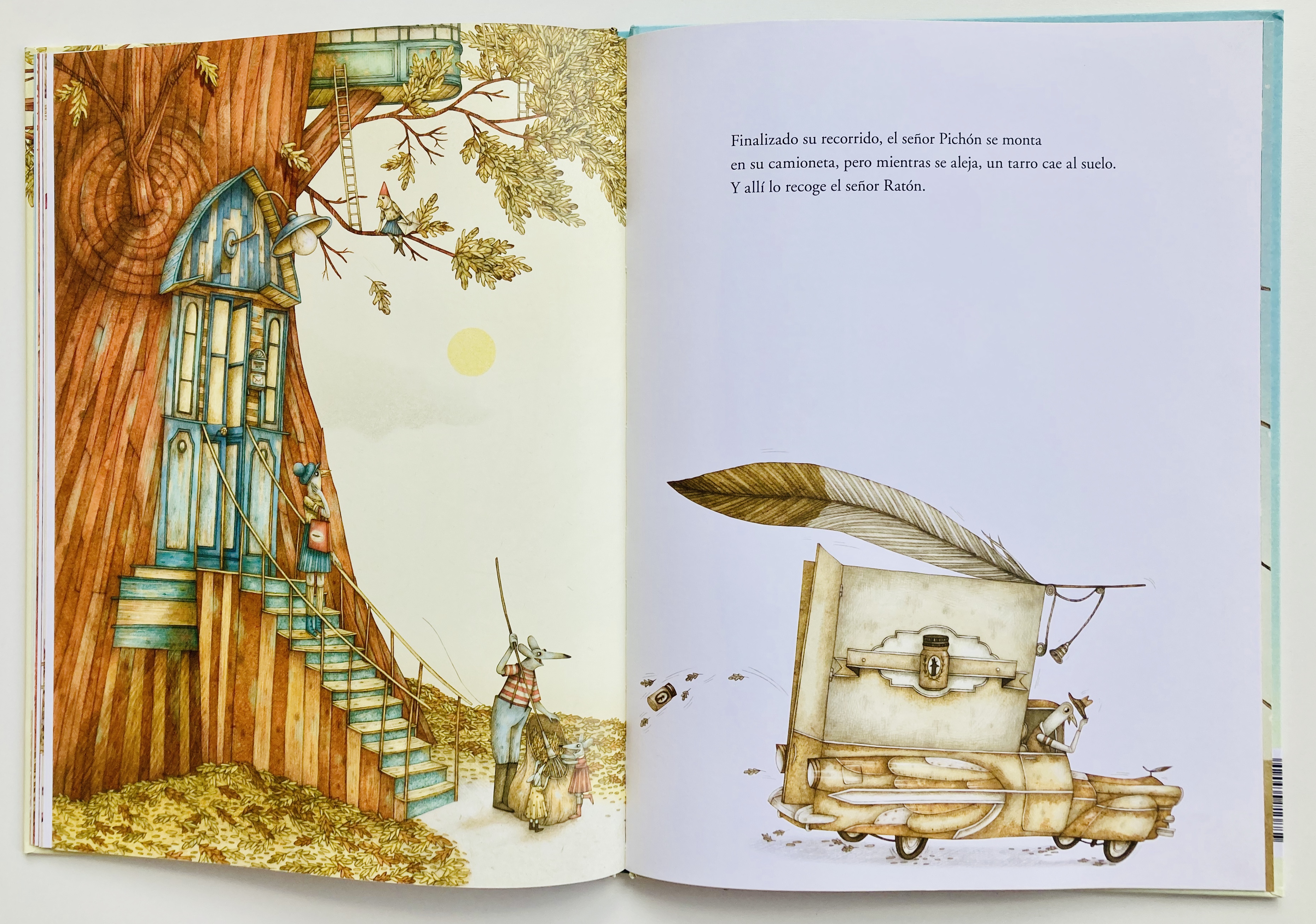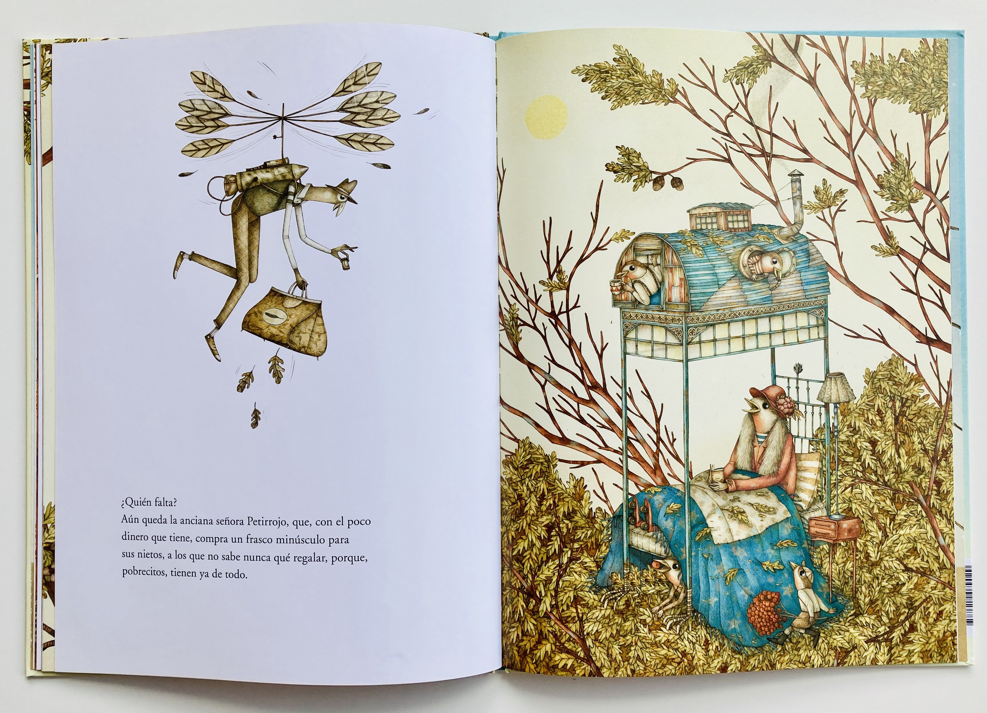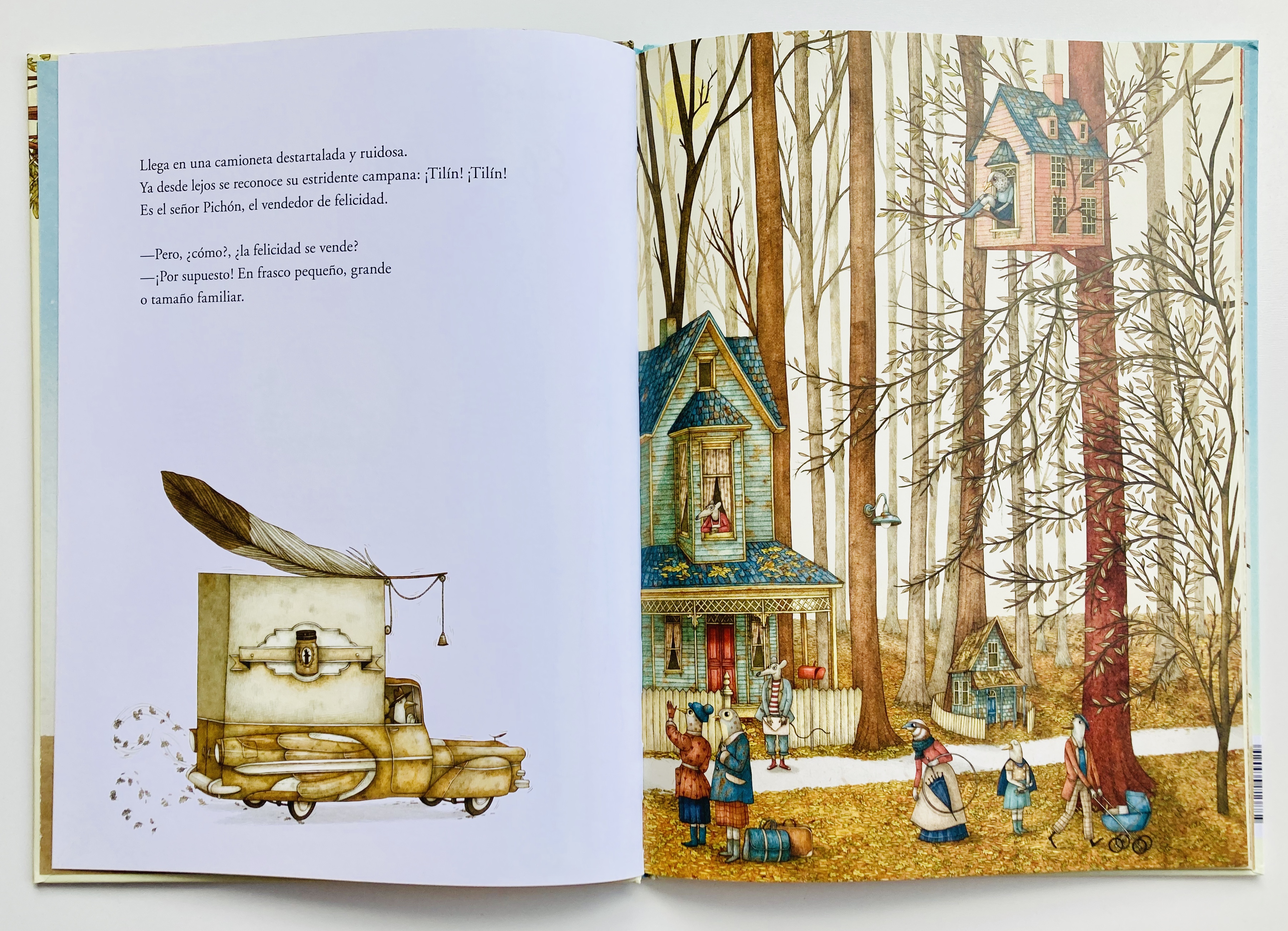 Las fascinantes ilustraciones de Marco Somà esta vez nos trasladan a un otoño prenavideño de un pequeño lugar en el bosque, donde sus habitantes los animales pasan los días colmados de hojas y rodeados de azules y ocres (con algún rojo siempre asomando). En este maravilloso escenario se desarrolla esta interesante fábula de Davide Calí, la cual nos lleva a reflexionar sobre el precio de la felicidad (si es que lo tiene).