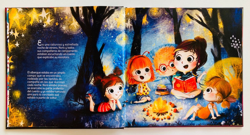 “En una calurosa y estrellada noche de verano, Nora y todos sus compañeros de campamento estaban escuchando un cuento que les contaba su monitora. El albergue estaba en un amplio campo que se encontraba rodeado por las tiendas de campaña en las que dormían cada noche.”