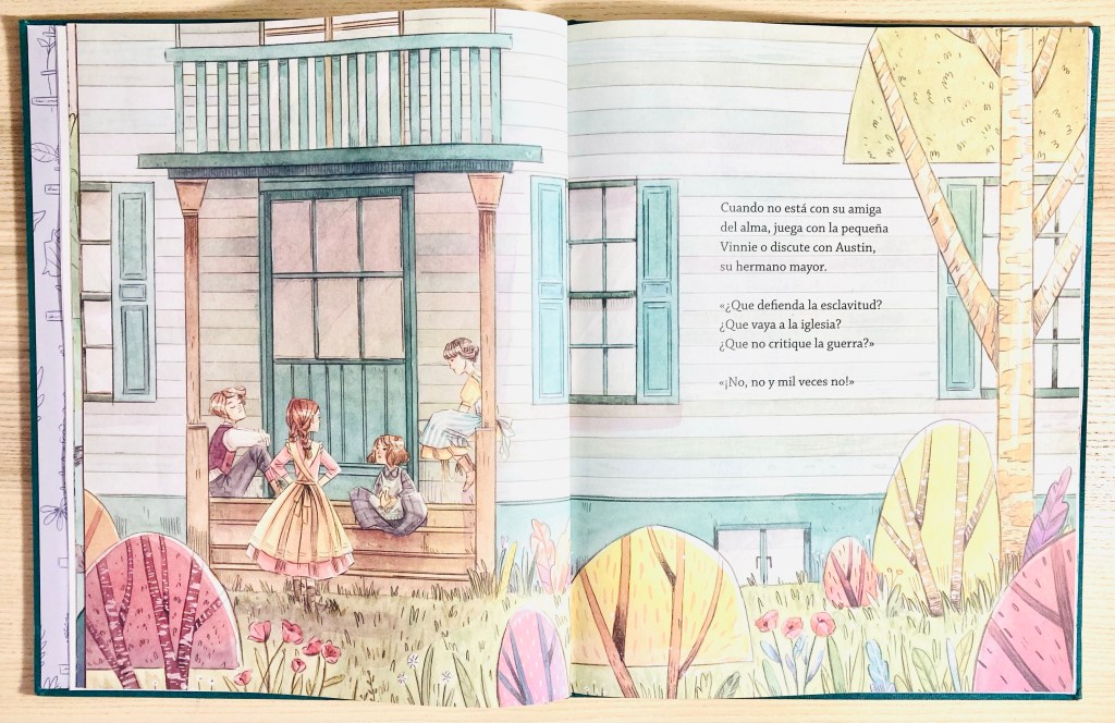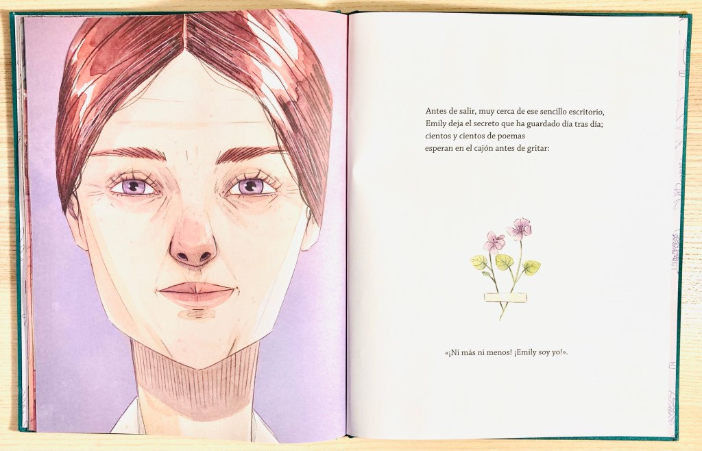En esta biografía para público infantil (o no), con un texto bello y delicado que acaricia la poesía, descubriremos quién fue esta gran escritora, una mujer rebelde en su tiempo que soñaba con ser mucho más de lo que la sociedad le tenía preparado. Una mente brillante que no se iba a conformar con ser según las expectativas de los demás. Una poetisa con un mundo interior inconmensurable que no fue capaz de reprimir sus palabras, dejándolas plasmadas en casi 2000 poemas que la llevaron a sentir y a viajar a mundos infinitos sin necesidad de salir de su habitación.