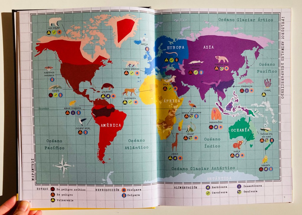 Nos ofrece 22 historias cortas que tienen como protagonistas a 22 animales habitantes de los 5 continentes cuya, en estos momentos, es vulnerable en diferentes grados. Para situarnos geográficamente, al inicio encontramos un mapamundi a doble página que, a modo esquemático, nos señala el lugar donde vive cada animal y, con unos iconos muy visuales, nos da información básica de cada uno sobre el tipo de alimentación y reproducción y sobre su estado de amenaza, usando tres colores para señalar el grado de peligro: amarillo para los vulnerables, naranja para los que se encuentran en peligro y rojo para los que se encuentran en peligro crítico de extinción.