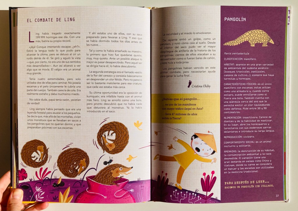 Tras el bonito relato (de verdad que todos me parecen bellísimos), y enmarcada en una columna a la derecha, tenemos una ficha técnica que contiene información científica sobre cada animal: nombre científico, clasificación en el reino animal, hábitat, características físicas, alimentación, tipo de reproducción y comportamiento social. Para terminar esta ficha informativa nos enumera las amenazas a las que están expuestos: pérdida de hábitat (cambio climático, incendios, explotación humana), comercio y caza ilegal, enfermedades,…