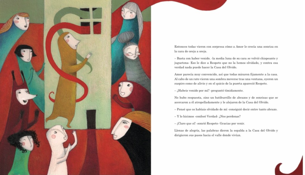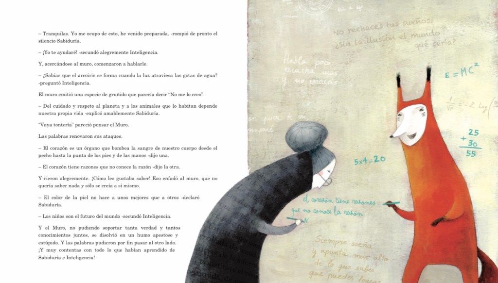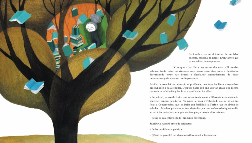 Elegidas con una sensibilidad exquisita, en este caso las palabras se convierten en auténticos personajes que tejerán un relato perfectamente hilado para hablarnos de la importancia que tiene envolverse de los valores adecuados y dejar que sean estos los que dominen nuestro sentir, nuestro pensar y nuestro actuar. Valores que hallaremos en la sana convivencia de la Sabiduría, la Felicidad, el Amor, la Comprensión, la Serenidad, el Cariño, la Inteligencia, el Sentido Común, la Verdad, el Valor, la Compasión… siendo todas ellas, junto a otras que se nombran y otras que aparecen sin necesidad de mención, las heroínas de esta historia.