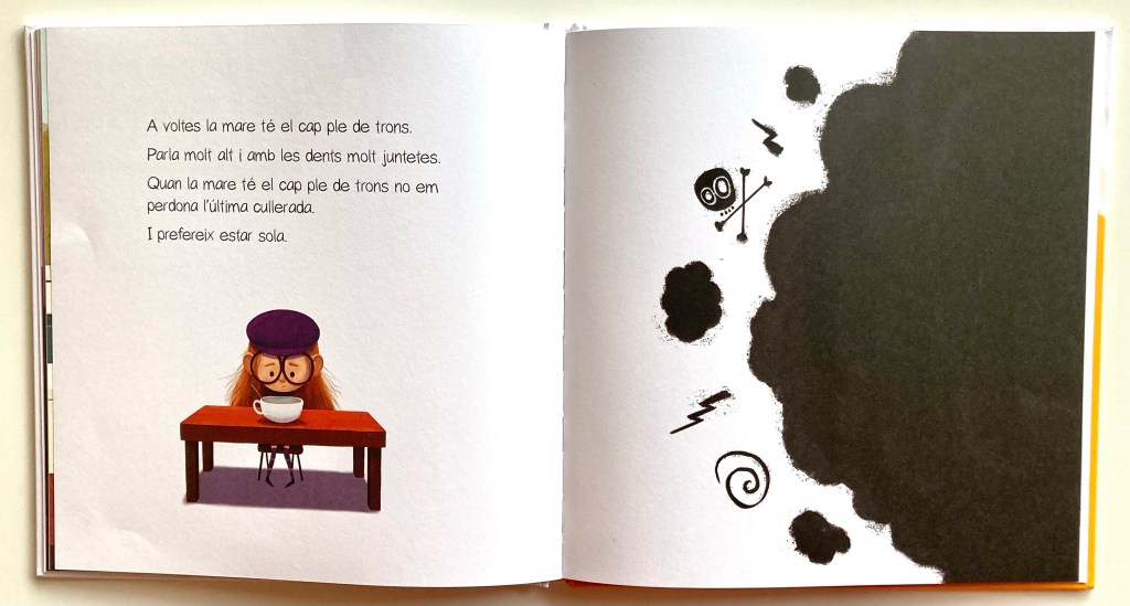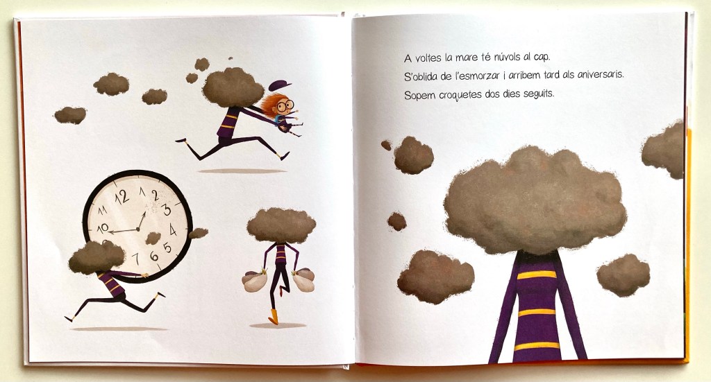 “A veces mamá tiene nubes en la cabeza. Se le olvida el almuerzo y llegamos tarde a los cumples. Cenamos croquetas dos días seguidos. Cuando mamá tiene nubes en la cabeza, sopla como un globo y se deshincha cuando se sienta en el sillón.”