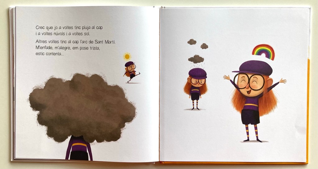 La mamá de esta pequeña de pelo rojizo tiene días de todo. A veces aparecen nubes en su cabeza, entonces anda algo agobiada y no todo le sale como desearía; a veces tiene un gran sol, y entonces juega con ella y está cargada de energía; a veces tiene lluvia, y en esos días se apaga su color y no tiene ganas de hacer nada; pero también hay días que le aparece un gran y colorido arcoíris, entonces está alegre y tiene ganas de hacer cosas súper divertidas; hay días que tiene la cabeza llena de estrellas y su mirada de ojos vidriosos se pierde a lo lejos; y también hay días en que la tiene llena de truenos, entonces habla muy fuerte y nada le parece bien. La pequeña protagonista sabe reconocer esos estados anímicos-meteorológicos en la cabeza de su mamá porque ella también los ha tenido en la suya alguna vez y, además, gracias a las gafas mágicas que le ha regalado, ahora es capaz de reconocerlos en las cabezas de los demás.
