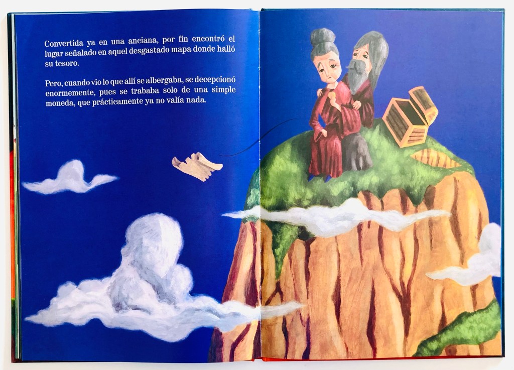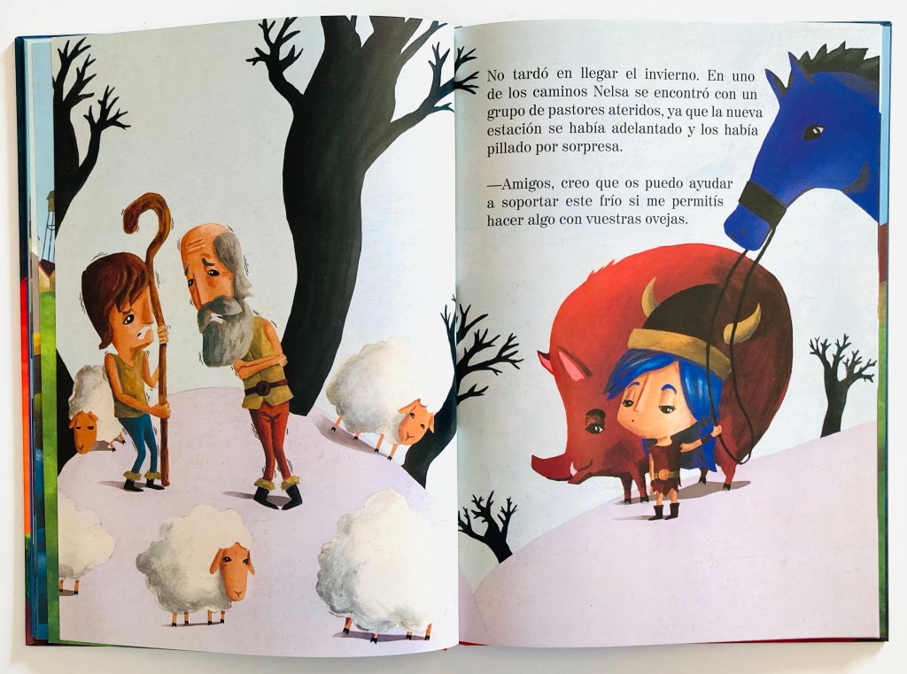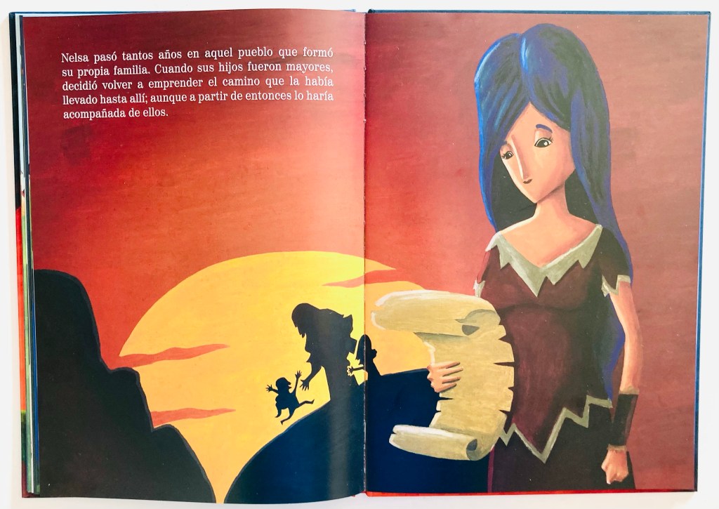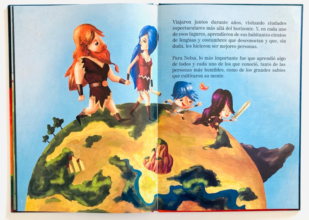 “En un pequeño valle, escondido entre las lejanas montañas del norte, vivía Nelsa, a la que todos también llamaban “la niña del corazón aventurero”, por su gran arrojo y valentía. Un día la pequeña encontró junto a un arbusto aquel misterioso mapa. Enseguida pensó que la llevaría hasta un incalculable tesoro, así que no dudó en pedir permiso a su familia para comenzar su gran aventura…”