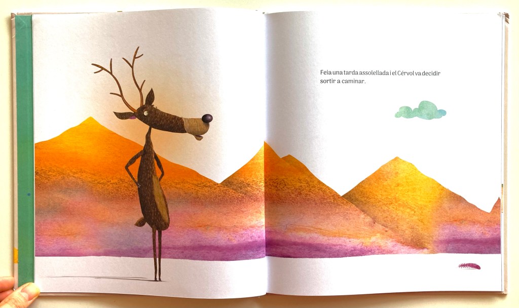 “Una soleada tarde de otoño, Ciervo decidió salir a caminar. Pero el paseo duró poco – ¡Qué lástima! Y cuando levantó la mirada… notó que eso que caía del cielo no era lluvia. ¡Era jirafa! -¿Qué pasa? ¿Por qué lloras? -Es que me di cuenta de que no sé cómo me veo, no sé cómo es mi rostro… ¡No sé cómo soy, y eso me pone muy triste!”