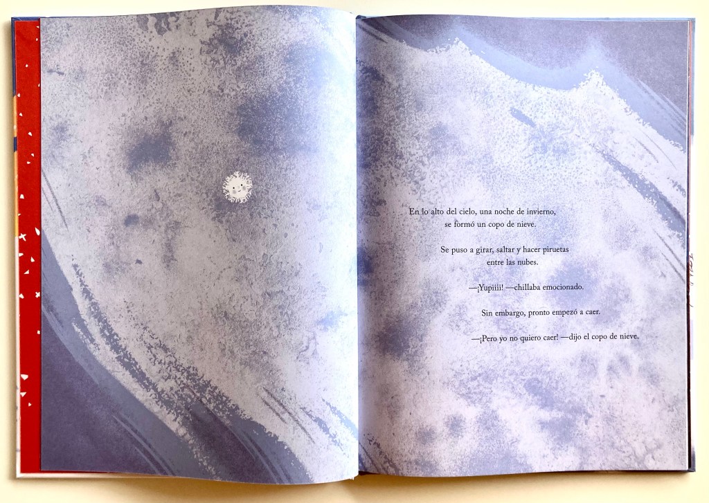 “En lo alto del cielo, una noche de invierno, se formó un copo de nieve. Se puso a girar, saltar y hacer piruetas entre las nubes. –¡yupiiii! –chillaba emocionado. Sin embargo, pronto empezó a caer. –¡Pero yo no quiero caer! –dijo el copo de nieve.”