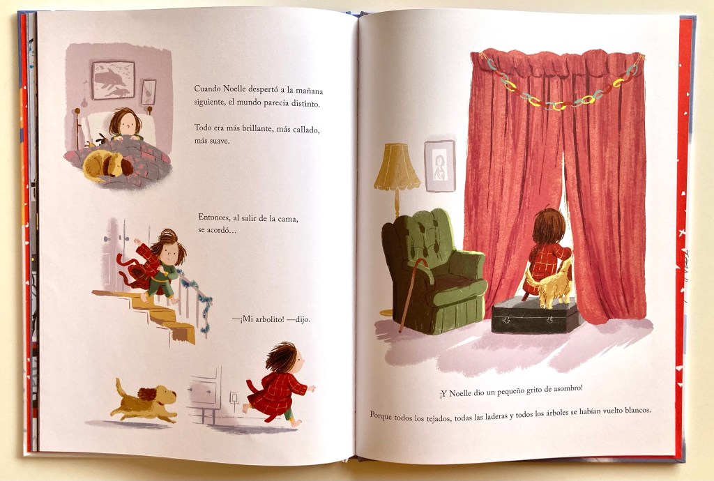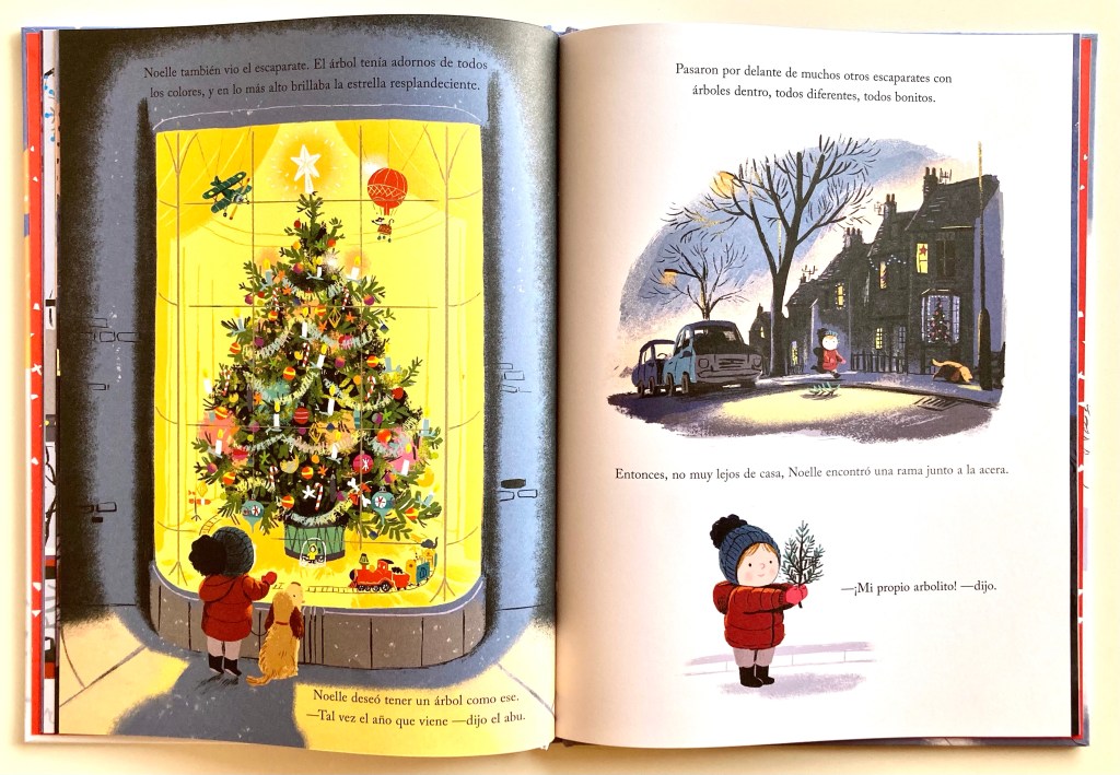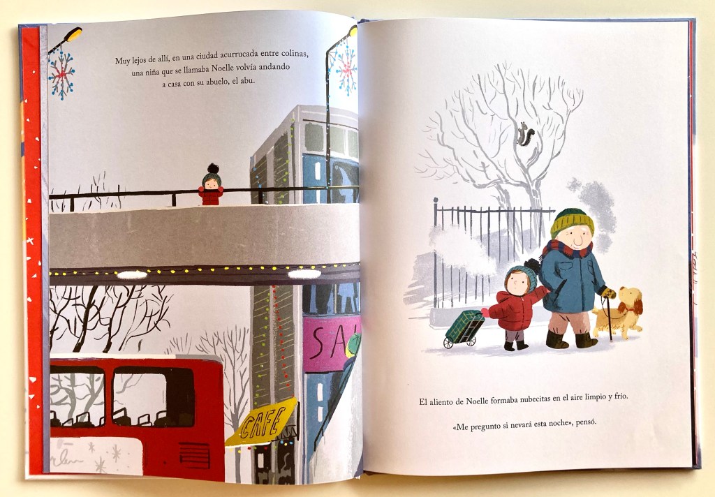 Noelle, en una estampa enternecedora y llena de cotidianidad, pasea con su abuelo y su perro en un atardecer frío de invierno. Es Navidad y su mayor deseo es que nieve para poder disfrutar, en esas fechas tan especiales, de un blanco y plácido paisaje. De camino a casa, queda completamente anonadada ante un árbol de navidad majestuoso expuesto en un reluciente escaparate. ¡Cuánto le gustaría poder tener un árbol como ese! Quizás el año que viene, dice el abuelo. Ese sentimiento de fascinación por el árbol se repite unos pasos más adelante, cuando encuentra una rama junto a la acera: ¡Su propio arbolito! Un momento conmovedor que nos sirve humildad, gratitud y esa felicidad sincera y espontánea tan típica de la infancia ante la sencillez de las cosas. Ya en su casa y junto a su querido abuelo (terminas el cuento queriéndolo tú también, ya verás 🙂 ) viste de Navidad a su pequeño árbol y lo coloca en el alféizar de la ventana, con la sensación de que algo le falta y yéndose a dormir con el persistente deseo de despertar al día siguiente en medio de un paisaje nevado.