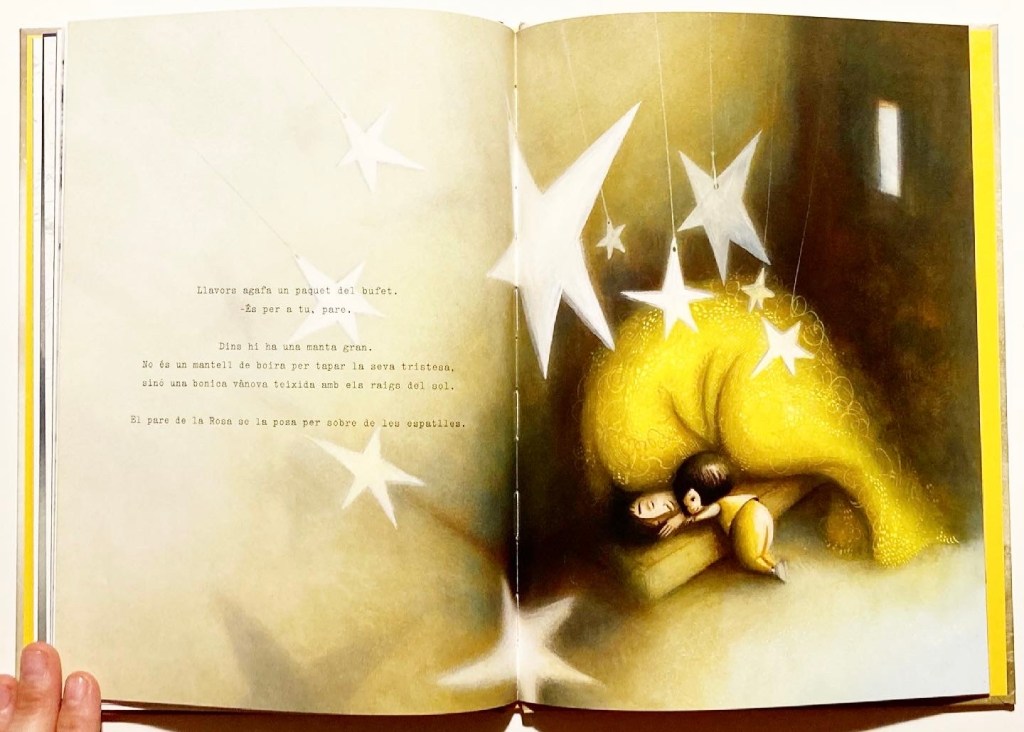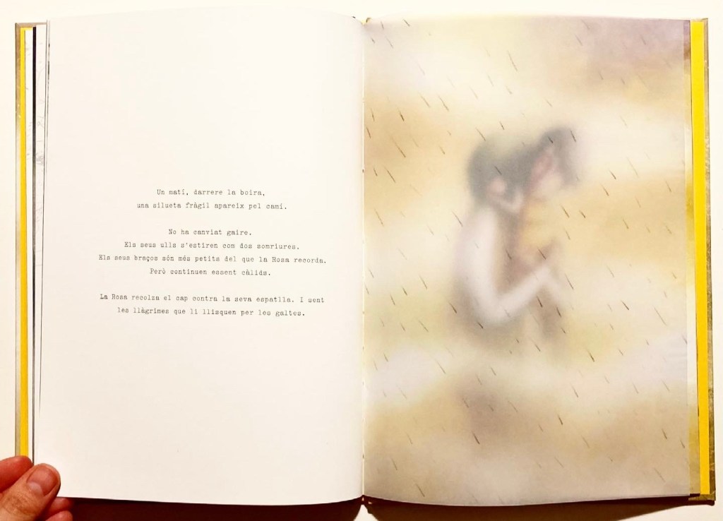 Rosa captura niebla para, con ella, tejer biombos, cortinas y visillos que servirán para tapar arrugas, deudas y, si es necesario, hasta personas. Tejidos efímeros que pronto cubren todo el país pero que rápido se desvanecen, dejando ver de nuevo lo que se oculta detrás, por lo que hay que renovarlos constantemente. Así, hilando sin descanso, pasan los días de esta triste niña hasta que, una mañana, tras la niebla, aparece el cartero con una carta que le acelera e ilumina el corazón. Es una carta de su padre que despierta todos sus recuerdos: sus besos, sus abrazos, sus caricias; pero también las peleas, los gritos y su partida, que, sin más explicaciones, la deja con un enorme vacío que la acompañará hasta ese gran momento en que, gracias a esa carta, vuelva a entrar luz en su vida. Su padre le anuncia su regreso y, con él, también el de sus abrazos. Abrazos que disiparán definitivamente la niebla para sustituirla por los cálidos y brillantes rayos del sol que usará para hilar, en primer lugar, una reluciente colcha para proteger a su padre, y que serán, a partir de ese momento, la nueva materia para confeccionar sus preciados tejidos.