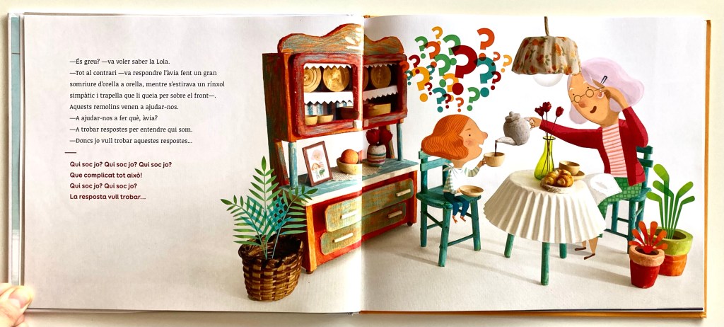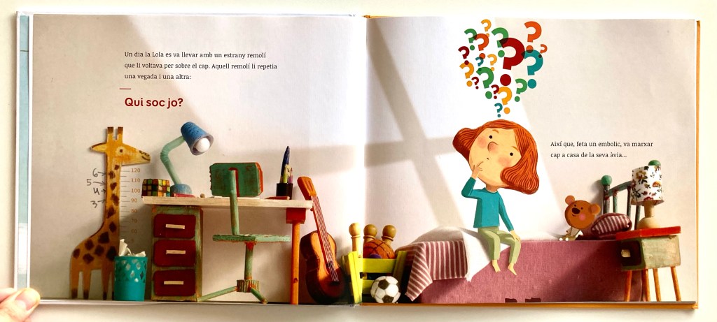Al llarg de les pàgines d’aquest bonic àlbum, amb unes il·lustracions que convinen elements reals amb dibuixos genials i que a casa (al Blai! 🙂 ) han agradat molt, acompanyarem a la Lola, una nena que, com moltes altres, és inquieta i curiosa, i vol trobar resposta a les seves incessants preguntes. Avui s’ha despertat amb tot un remolí sobre el seu cap ple d’interrogants i amb una gran qüestió per resoldre: Qui sóc jo?