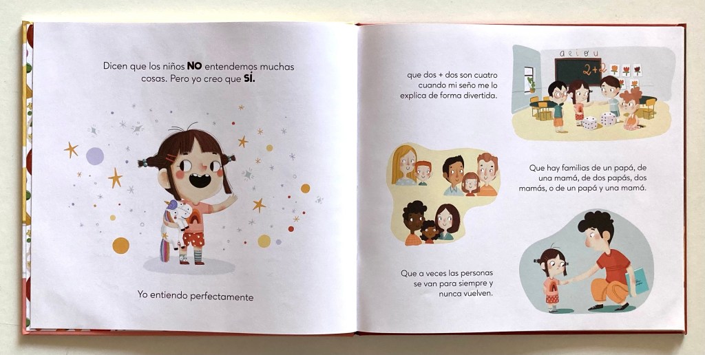 “Dicen que los niños NO entendemos muchas cosas. Pero yo creo que SÍ. Yo entiendo perfectamente que dos + dos son cuatro cuando mi seño me lo explica de forma divertida. Que hay familias de un papá, de una mamá, de dos papás, dos mamás, o de un papá y una mamá. Que a veces las personas se van para siempre y nunca vuelven.”