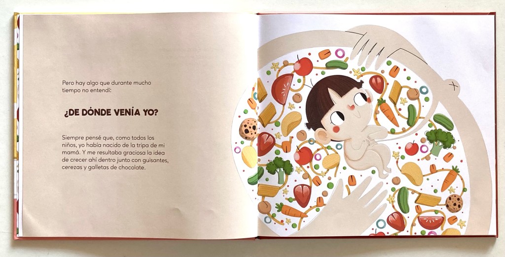 Emma puede entender muchas cosas, pero hay algo que no termina de entender: ¿De dónde viene ella? Siempre había creído que, como todos los demás, había crecido en la tripa de su mamá (entre guisantes, cerezas y galletas de chocolate 😉 ), pero un día su mamá le explica que ella no estuvo exactamente allí, sino en su corazón (¿?). Asimismo, ha oído también otras historias muy disparatadas sobre su procedencia que la tienen algo confusa… Entonces, ¿viene de otro planeta?, ¿la trajeron las cigüeñas?, ¿salió de un huevo?… Cuando su mamá se da cuenta del tremendo lío que se ha formado, decide explicarle cuál es su verdadero origen: Emma nació de la tripa de otra mujer que no podía o no sabía cuidarla, así que buscaron a alguien que sí pudiera hacerlo y ¡ahí estaba su mamá!, dispuesta a quererla como el resto de mamás del mundo quieren a sus pequeños. ¡Ahora sí! Finalmente Emma lo entendía todo. Con lo fácil que hubiera sido contárselo desde el principio…