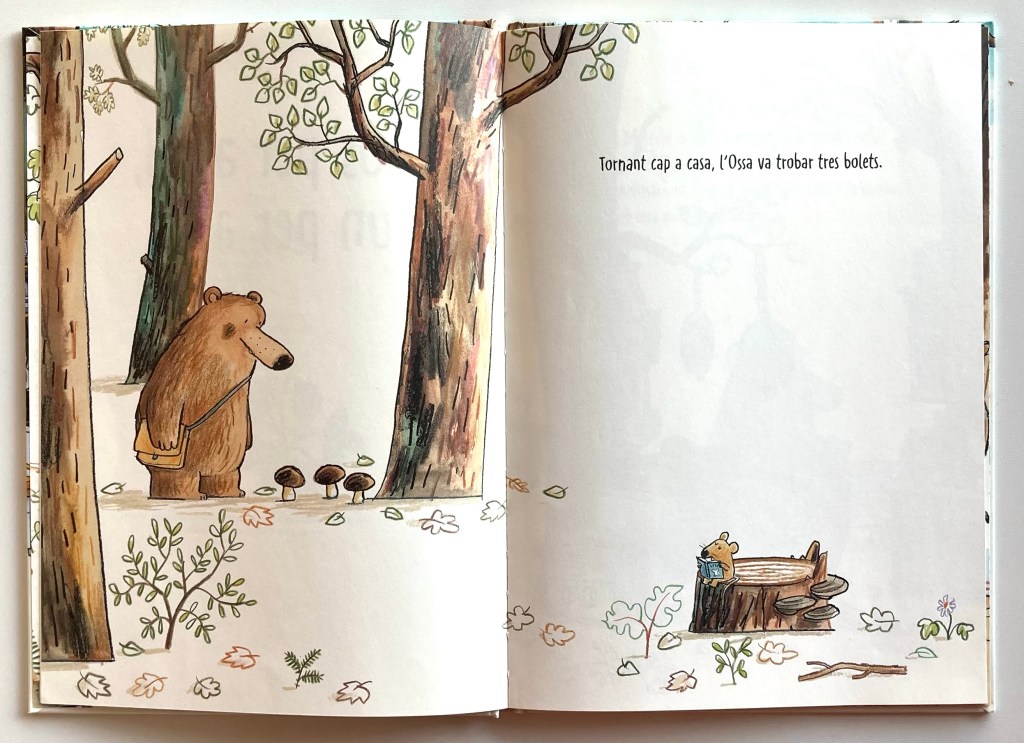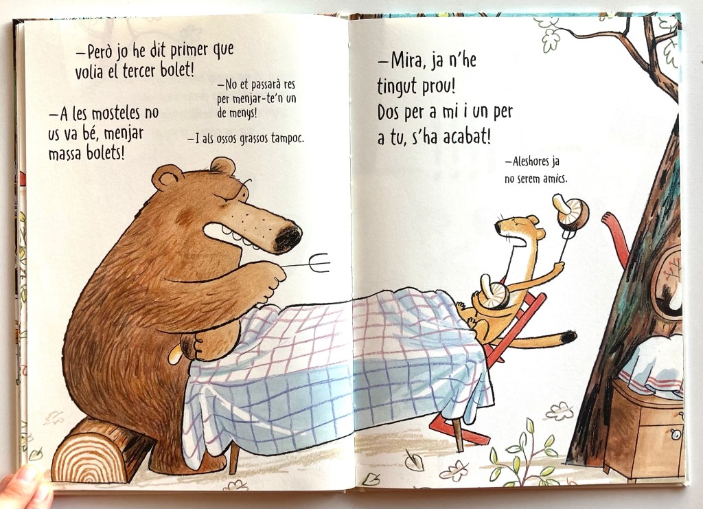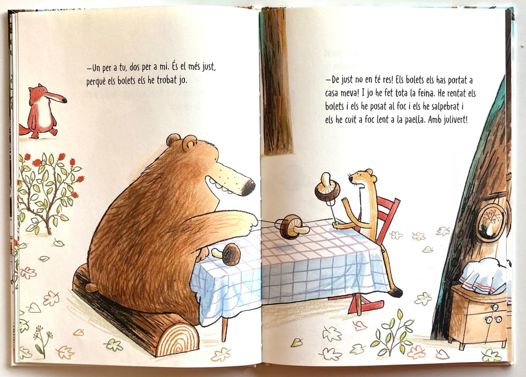 “Volviendo a casa, Oso encontró tres setas. Comadreja estaba muy emocionada. Las limpió, las tostó, las sazonó con mucha sal y pimienta y las cocinó a fuego lento en la sartén con un poco de perejil. Oso las sirvió. – Una seta para mi y una para ti. Y la otra, para mí. Es lo justo. Soy grande y tengo que comer mucho.”