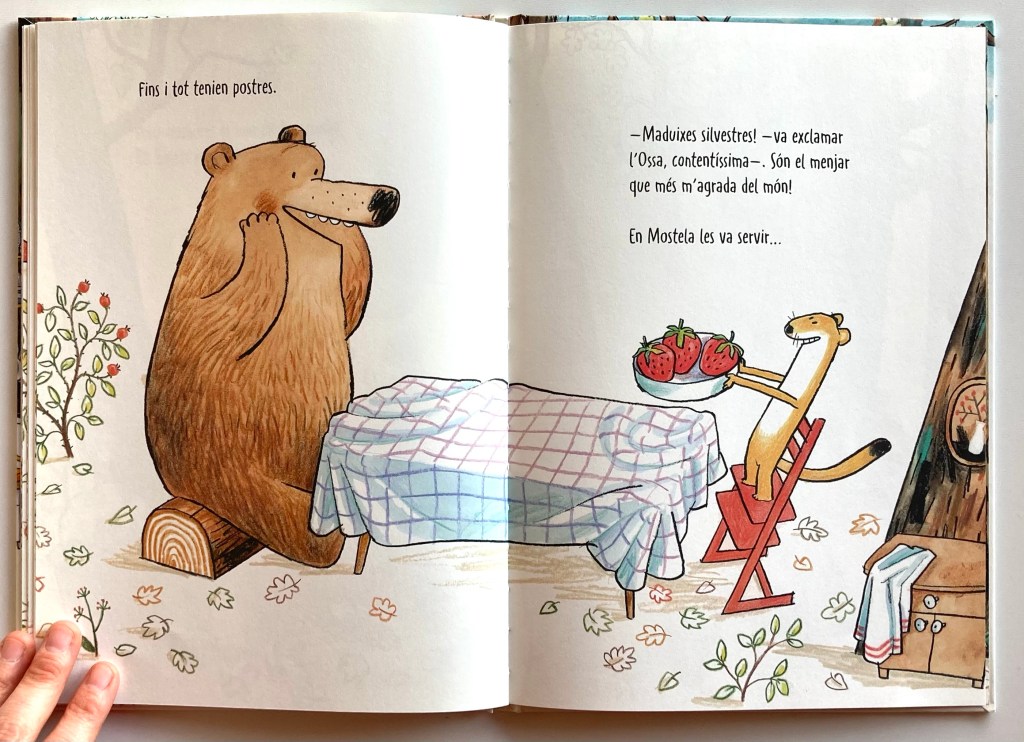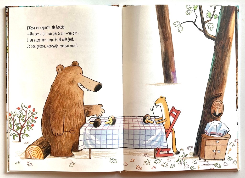 Nos trasladamos al bosque, pero no a un bosque cualquiera, al bosque donde Oso y Comadreja tienen su dulce hogar. En la cocina (con un diseño ideal que la integra perfectamente con el entorno 😉 ) será donde transcurran los hechos. Oso ha encontrado tres setas, Comadreja las ha cocinado, todo está listo para poder degustar el riquísimo manjar, pero antes…. ¡Hay que repartirlas!