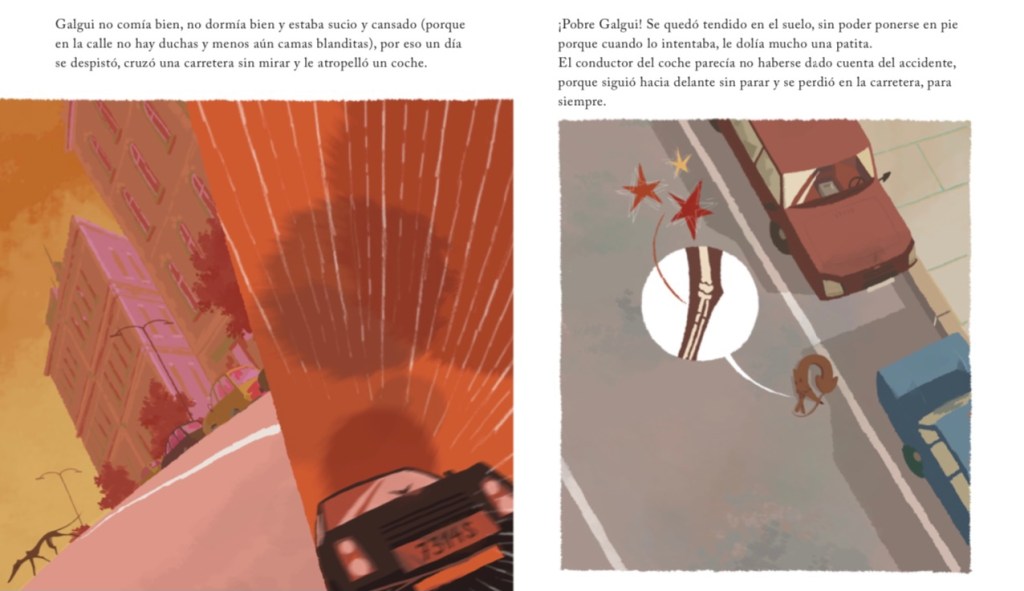 Afortunadamente, gracias a la literatura (en este caso, infantil) existe la posibilidad de crear conciencia y reflexionar a partir de historias ficticias (o no tanto) que permiten vestirnos con trajes que, quizás, si no fuera así, no valoraríamos ponernos. En este caso nos pondremos en la piel de Galgui, un perro vagabundo que, tras ser atropellado, vivirá su momento de máximo abandono y soledad cuando la incomprensión y la indiferencia sea lo único que reciba de su alrededor.