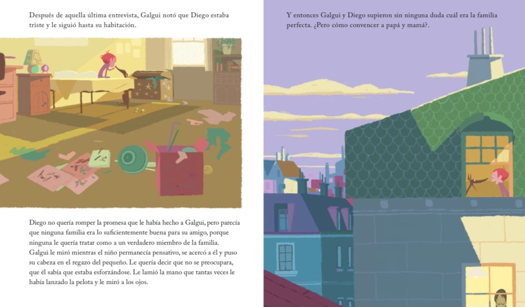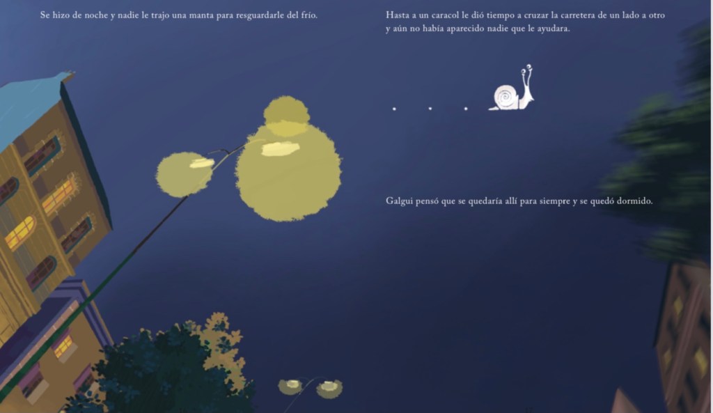 “Galgui era un perro vagabundo, pero no le gustaba la vida en la calle. No le gustaba dormir bajo un árbol aunque todas las estrellas brillaran sobre él (es que por la noche hacía mucho frío); No le gustaba rebuscar algo que comer en la basura (es que la comida de la basura olía a… basura)”