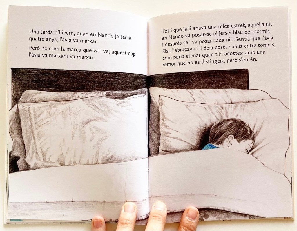 Elsa, la abuela de Nando, en cuanto sabe que va a ser abuela, no duda un instante en ir a comprar un ovillo de lana azul para tejer con sus propias manos un jersey para su nieto. En él teje tibiezas para afrontar y superar los malos momentos, pruebodenuevos para perseverar y volverlo a intentar siempre, y puntos de paciencia para saber gestionar las desesperanzas. Un regalo que, tras tejer, destejer y volver a tejer, llega a manos del destinatario en su tercer cumpleaños, vehiculizando con él ese amor incondicional de abuela, y aportando calidez y bienestar a Nacho cuando, llevándolo puesto, lo sienta como su hogar. Un jersey que llevará con él la esencia de Elsa el día que ella falte y que acogerá y acunará la tristeza sobrevenida tras su pérdida. Un jersey que emanará la generosidad que conduce a Nando a compartirlo con su hermana pequeña para entregarle, a través de él, el amor que la abuela hubiera sentido, sin lugar a dudas, también por ella.