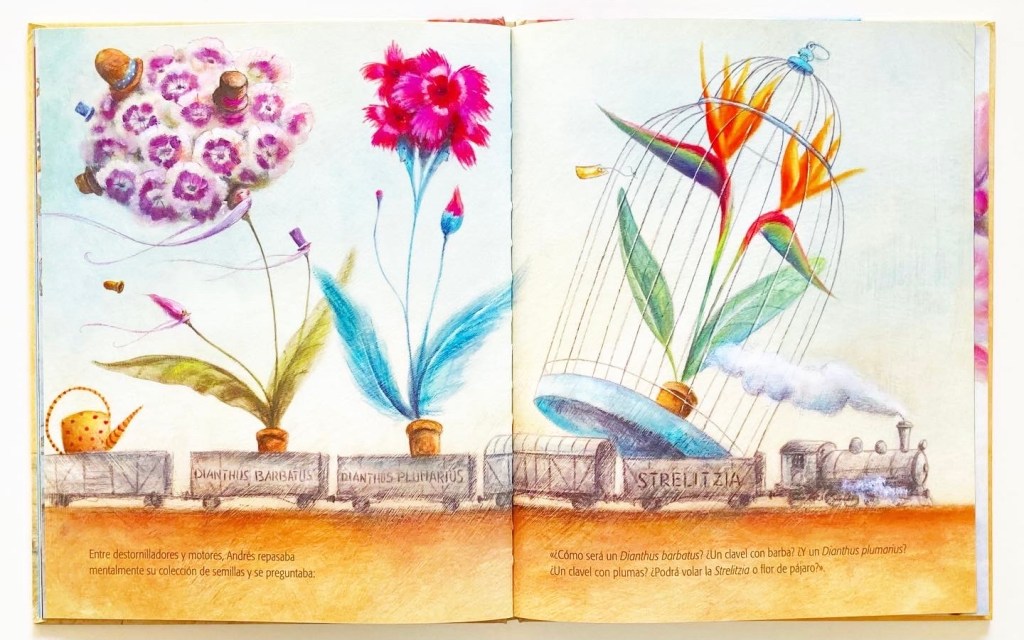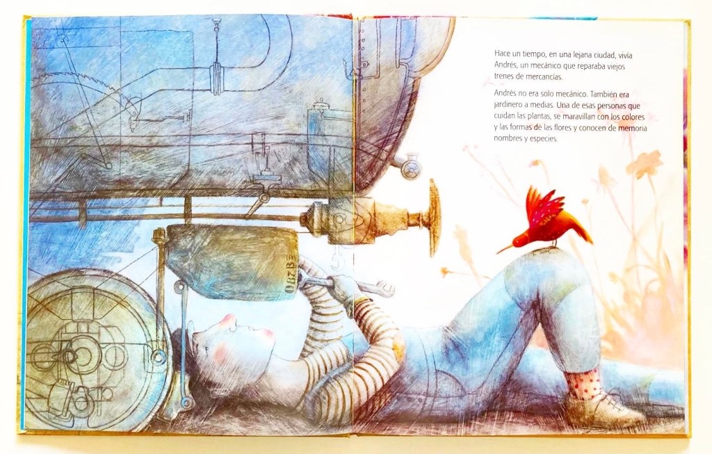 “Hace un tiempo, en una lejana ciudad, vivía Andrés, un mecánico que reparaba viejos trenes de mercancías. Andrés no era sólo mecánico. También era jardinero a medias. Una de esas personas que cuidan las plantas, se maravillan con los colores y las formas de las flores y conocen de memoria nombres y especies.”