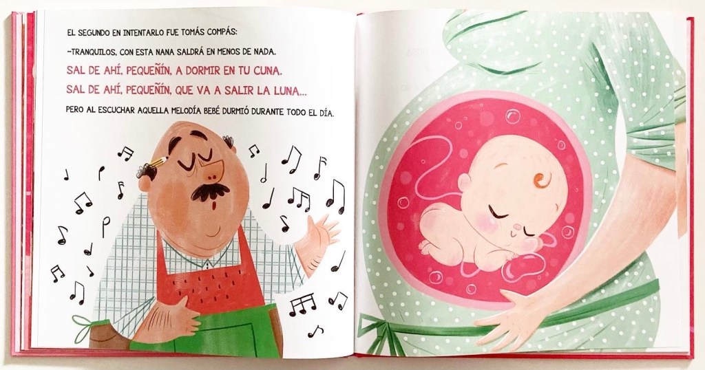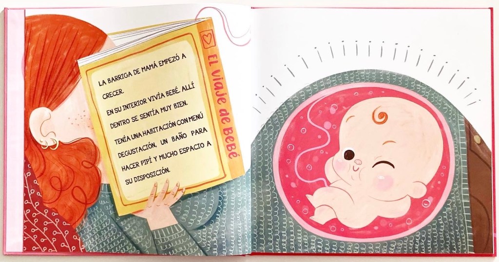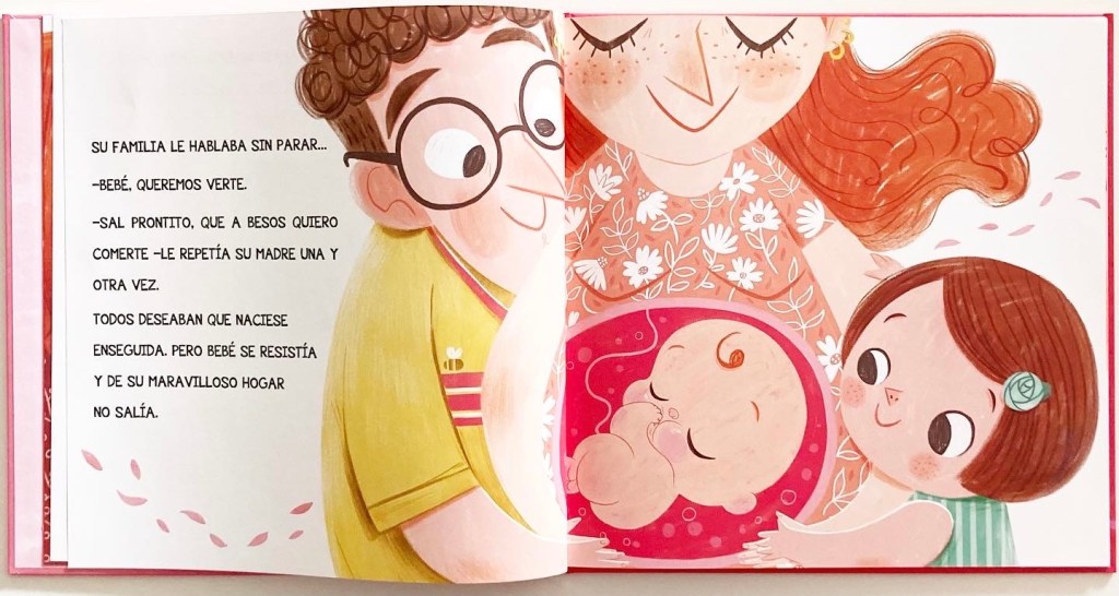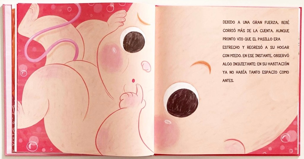 “La barriga de mamá empezó a crecer. En su interior vivía bebé. Allí dentro se sentía muy bien. Tenía una habitación con menú degustación. Un baño para hacer pipí y mucho espacio a su disposición.”