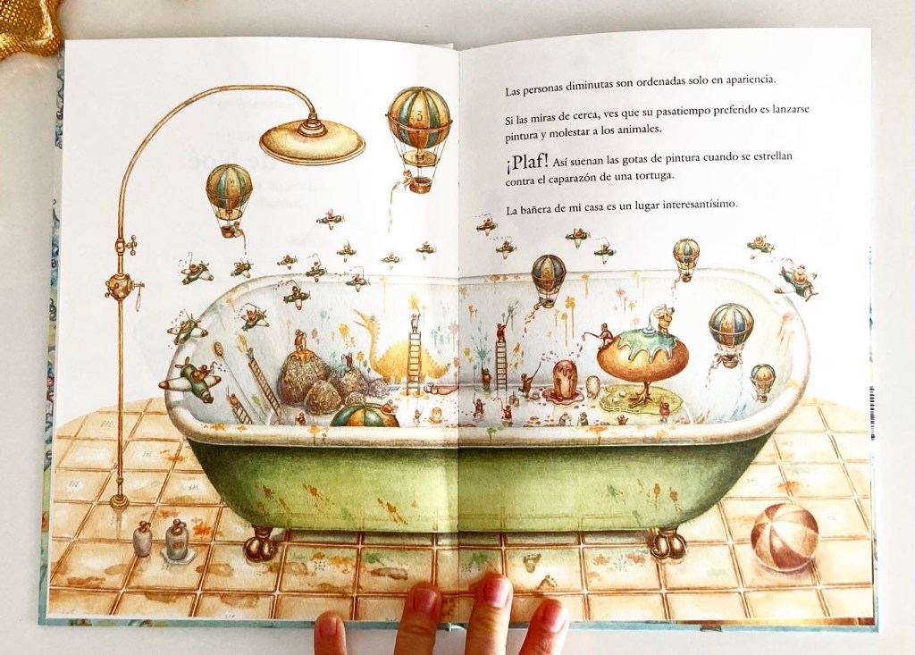 «Las personas diminutas son ordenadas solo en apariencia. Si las miras de cerca, ves que su pasatiempo preferido es lanzarse pintura y molestar a los animales. ¡Plaf! Así suenan las gotas de pintura cuando se estrellan contra el caparazón de una tortuga. La bañera de mi casa es un lugar interesantísimo.«