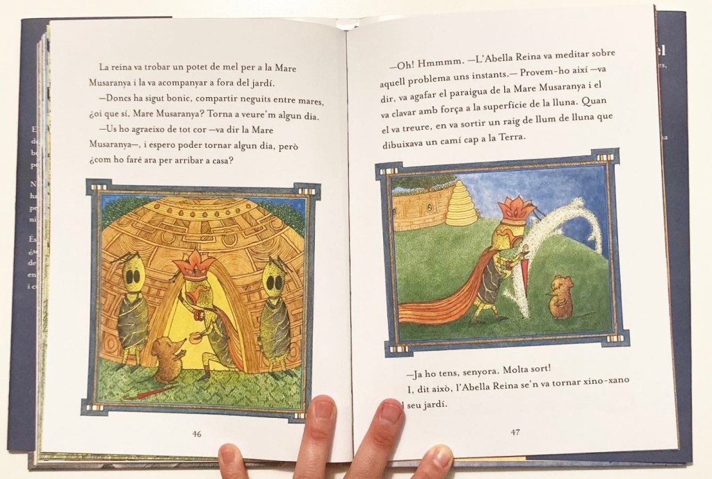 Una historia llena de fantasía donde la perseverancia y el empeño de la mamá musaranya, paraguas rojo en mano, la llevará hasta el Jardín de la Abeja Reina, en la misma luna, para pedirle a su majestad un poco de miel de luna para poder curar a su pequeño, Hugo, que está gravemente enfermo y solo con esa exquisita miel va a poder sanar.
