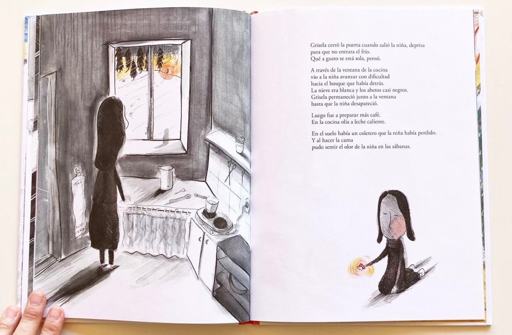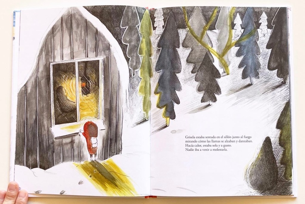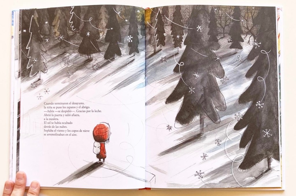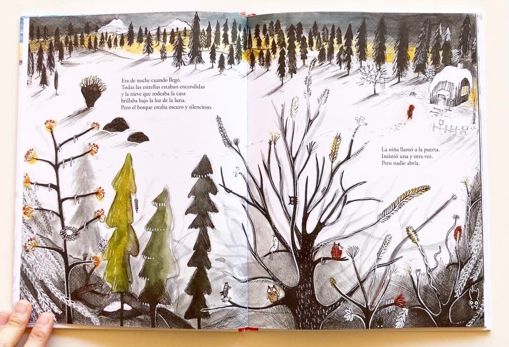 “Era de noche cuando llegó. Todas las estrellas estaban encendidas y la nieve que rodeaba la casa brillaba bajo la luz de la luna. Pero el bosque estaba oscuro y silencioso. La niña llamó a la puerta. Insistió una y otra vez. Pero nadie abria.”