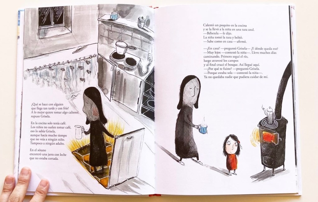 GRISela, que sólo quiere atender a la niña por una rato y luego seguir a lo suyo, le prepara un vaso de leche caliente en una taza azul mientras escucha como la niña cuenta, sin referencias directas a la guerra, de dónde viene y porqué ha tenido que marcharse de allí.