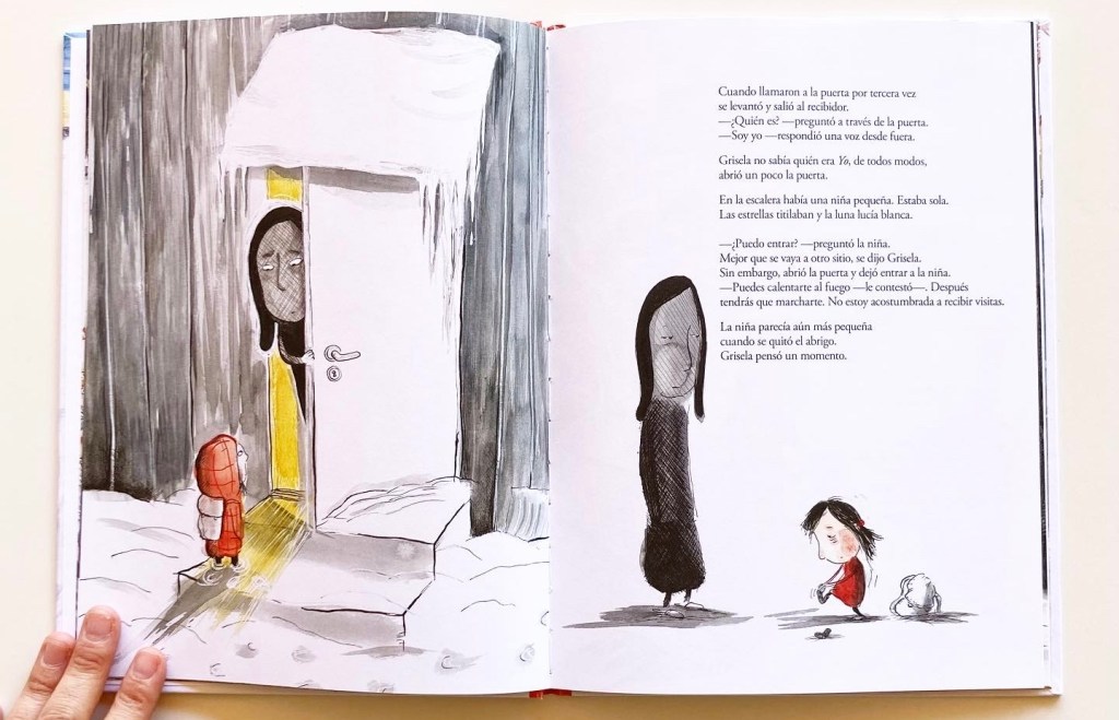 Encuentra una casa y llama a su puerta. Tras insistir varias veces, finalmente GRISela, que no esperaba a nadie, abre y, con cara de pocos amigos, deja entrar a la niña para que pueda calentarse un poco antes de volver a irse.