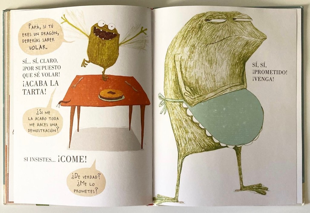 Inmersos en ese “momento comida” en el que toda madre y todo padre quisieran que su peque se lo comiera todo (y sin rechistar, a poder ser), papá sapo, dando poca validez a los gustos de su hijo, miente sobre los ingredientes de la tarta casera que ha elaborado para así hacerla más apetecible.
