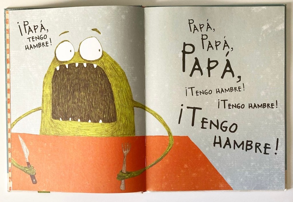 “¿Papá? ¡Papá, tengo hambre! Papá, Papá, Papá, ¡Tengo hambre! ¡Tengo hambre! ¡Tengo hambre! ¡Ya va! ¡Ya va! ¡Aquí está! ¡El señor está servido! Cuidado, que está muy caliente. Papá, ¿qué es esto? Es una deliciosa tarta de hadas, ¡Toda para ti!”