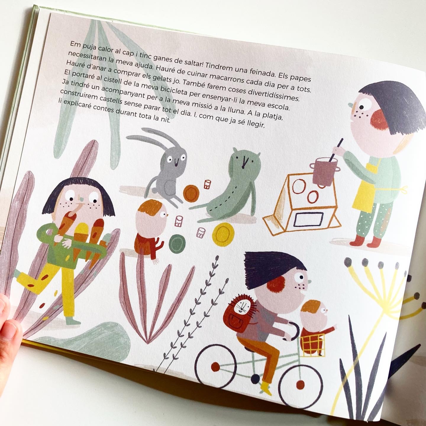 “Tindré un germanet. La Berta també en té un. Mmm… Li he de preguntar si és divertit viure amb un desconegut. La mama no pot sortir amb bicicleta amb mi. El papa diu que les meves joguines també seran del germanet. No entenc per què estan tan contents. Tinc un rum-rum a la panxa. A mi tot això em sembla un rotllo.”