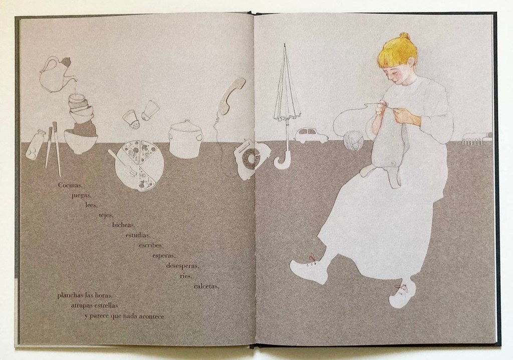“Cocinas, juegas, lees, tejes, bicheas, estudias, escribes, esperas, desesperas, ríes, calcetas, planchas las horas, atrapas estrellas y parece que nada acontece.”