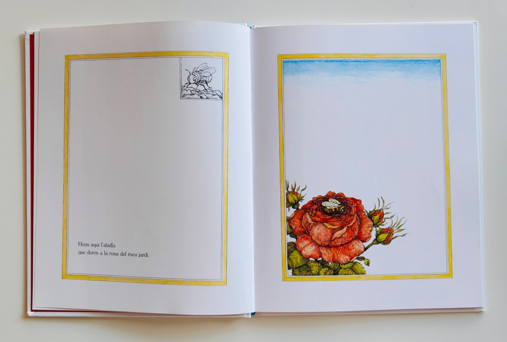 Con un final algo agitado que interrumpe el apacible sueño de la abeja y que nos ofrece unas ilustraciones a doble página en las que los detalles paran el tiempo, de repente la rosa, esa rosa con la que todo comienza, vuelve a ser la protagonista.