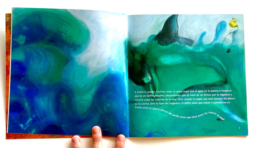 “A Estela le gustan muchas cosas. Le gusta jugar con el agua en la bañera e imaginar que es un delfín pequeño, pequeñísimo, que se mete de un brinco por la regadera y recorre todas las tuberías de la casa.”