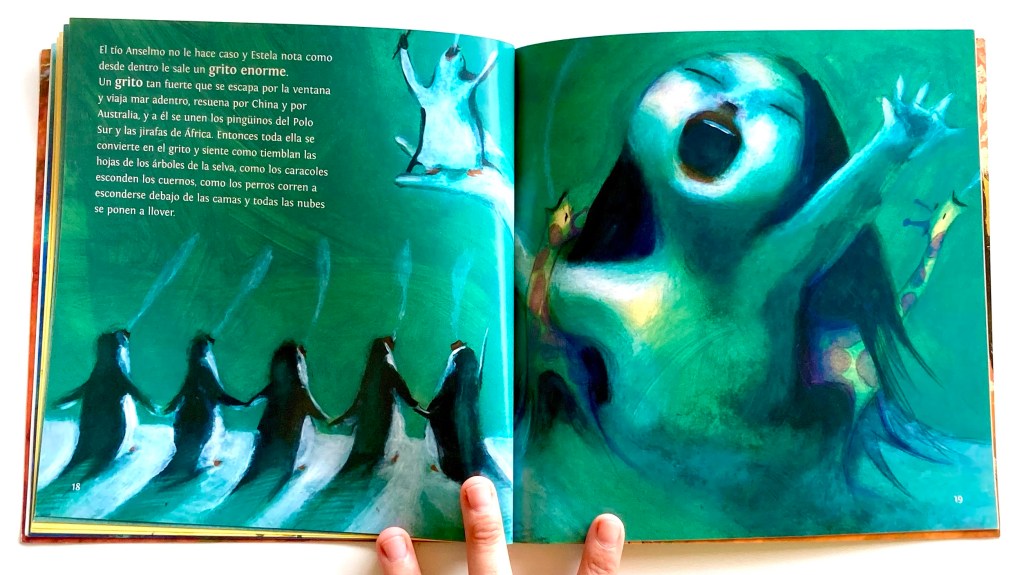 Hasta que un día, llevada por una sensación horrible que la recorre de pies a cabeza, y acordándose de los consejos de su maestra, empieza a gritar, a gritar muy fuerte, tan fuerte que su grito viaja atravesando paredes hasta los oídos de sus padres, que acuden al momento para abrazar, consolar y escuchar todo lo que su hija les tiene que contar.