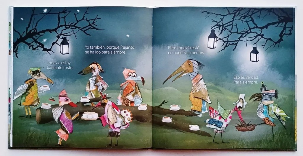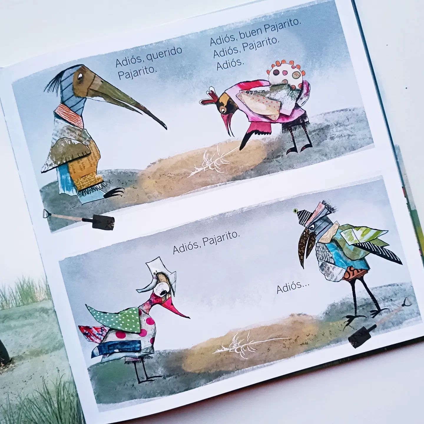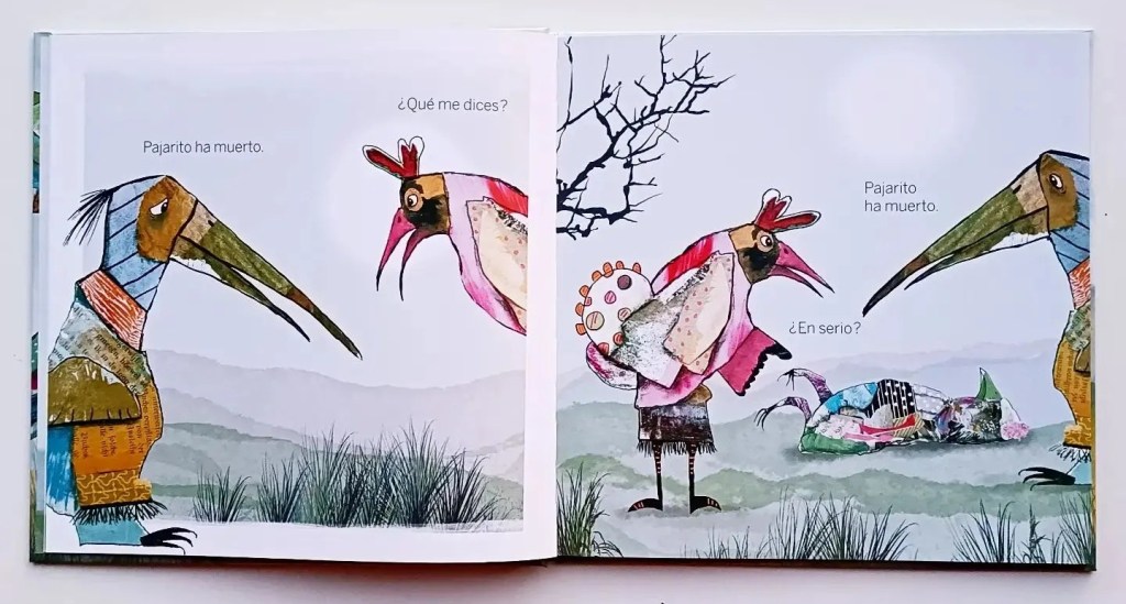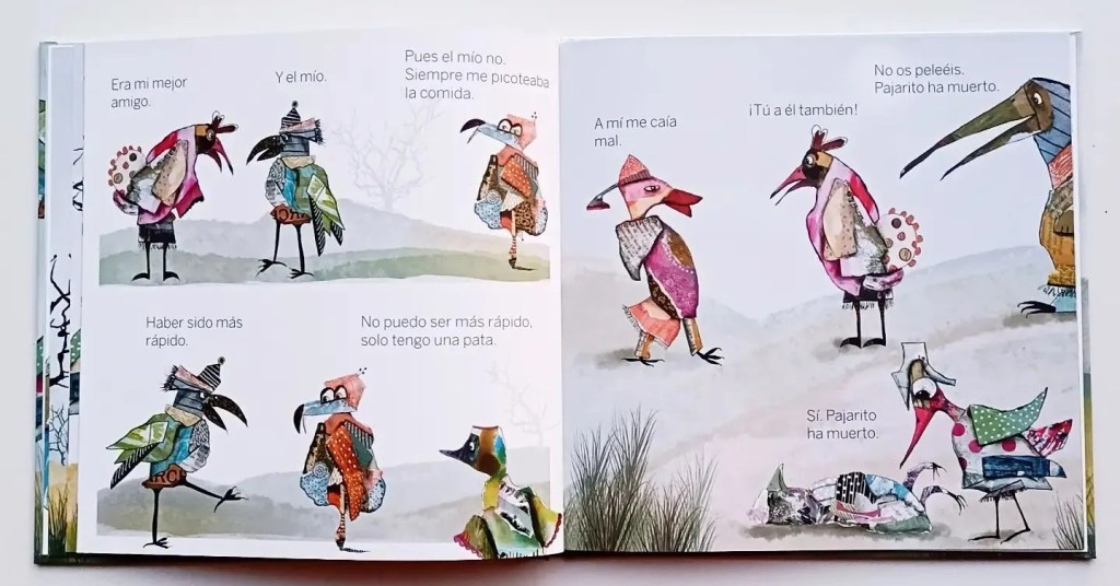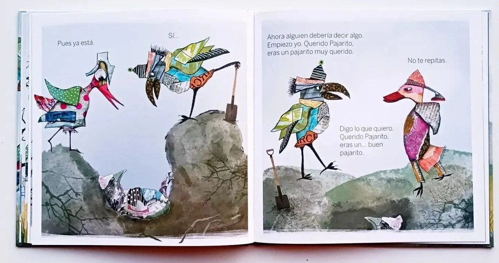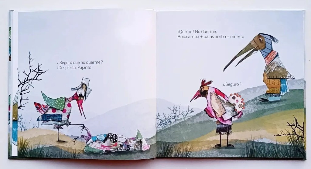 “Pajarito ha muerto. ¿Qué me dices? Pajarito ha muerto. ¿En serio? ¿Seguro que no duerme? ¡Despierta, Pajarito! ¡Que no! Boca arriba + patas arriba = muerto. ¿Seguro?”